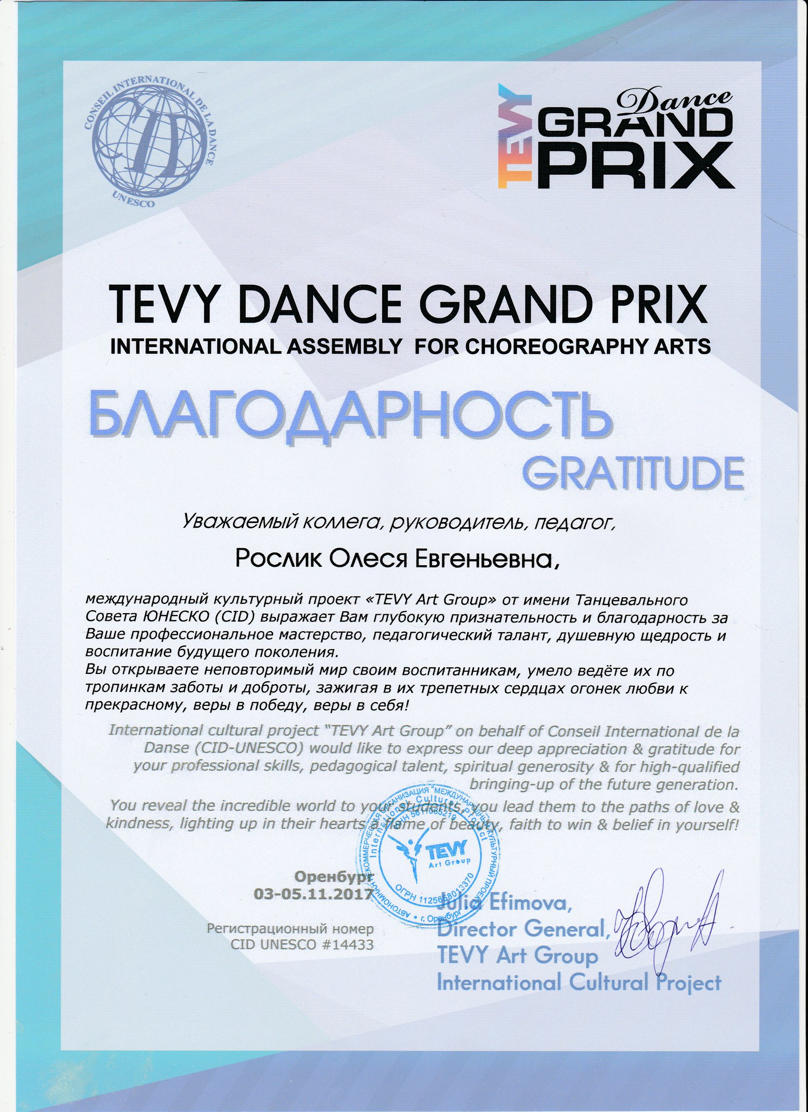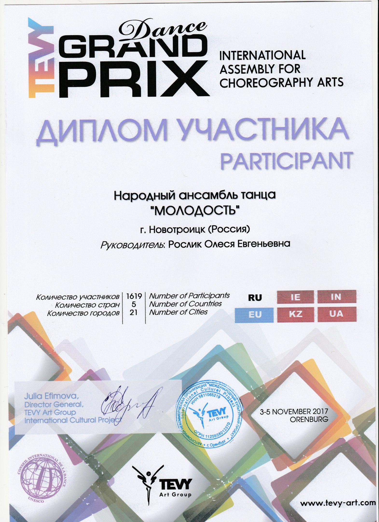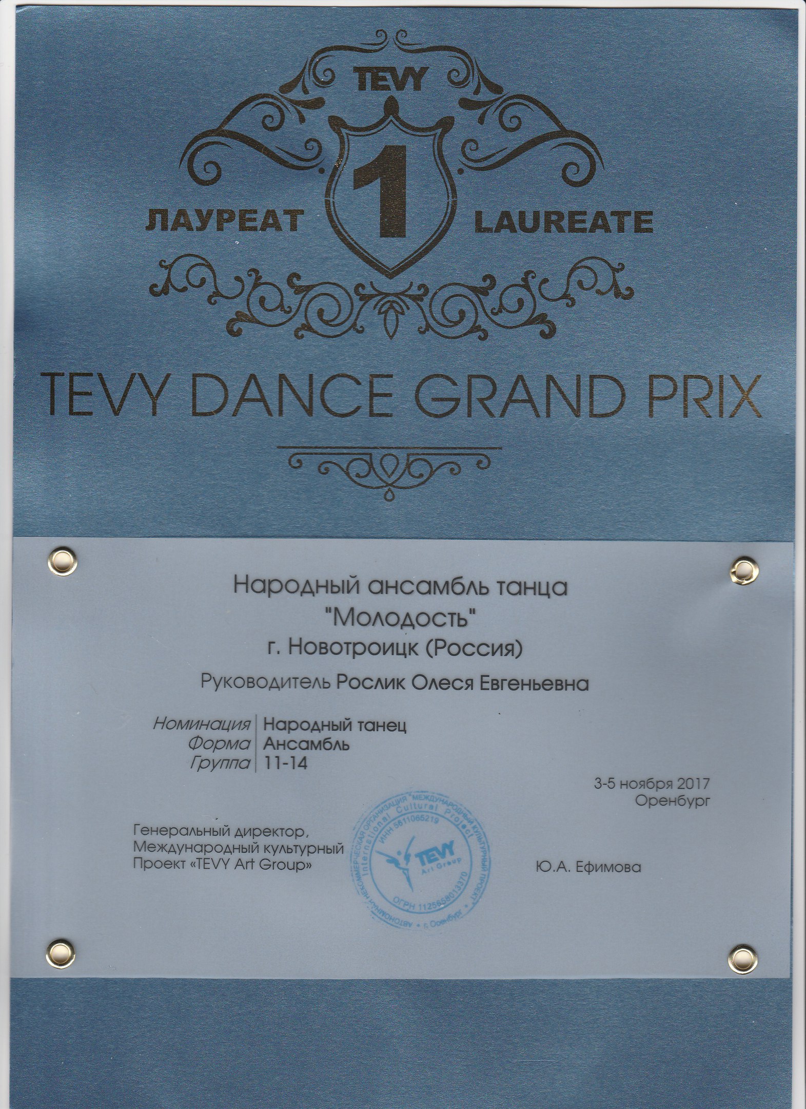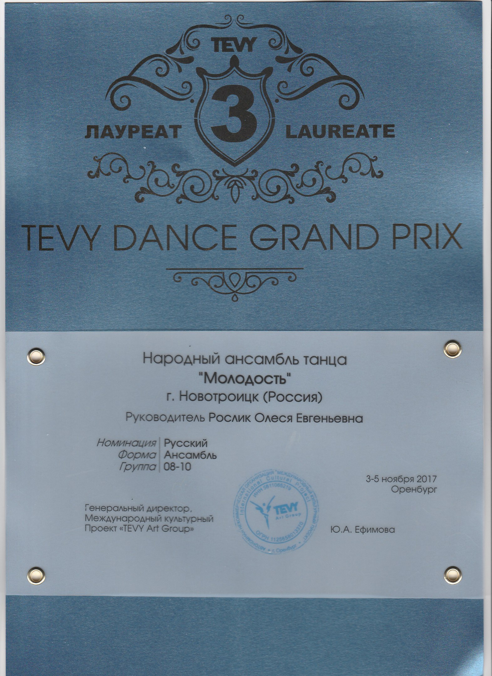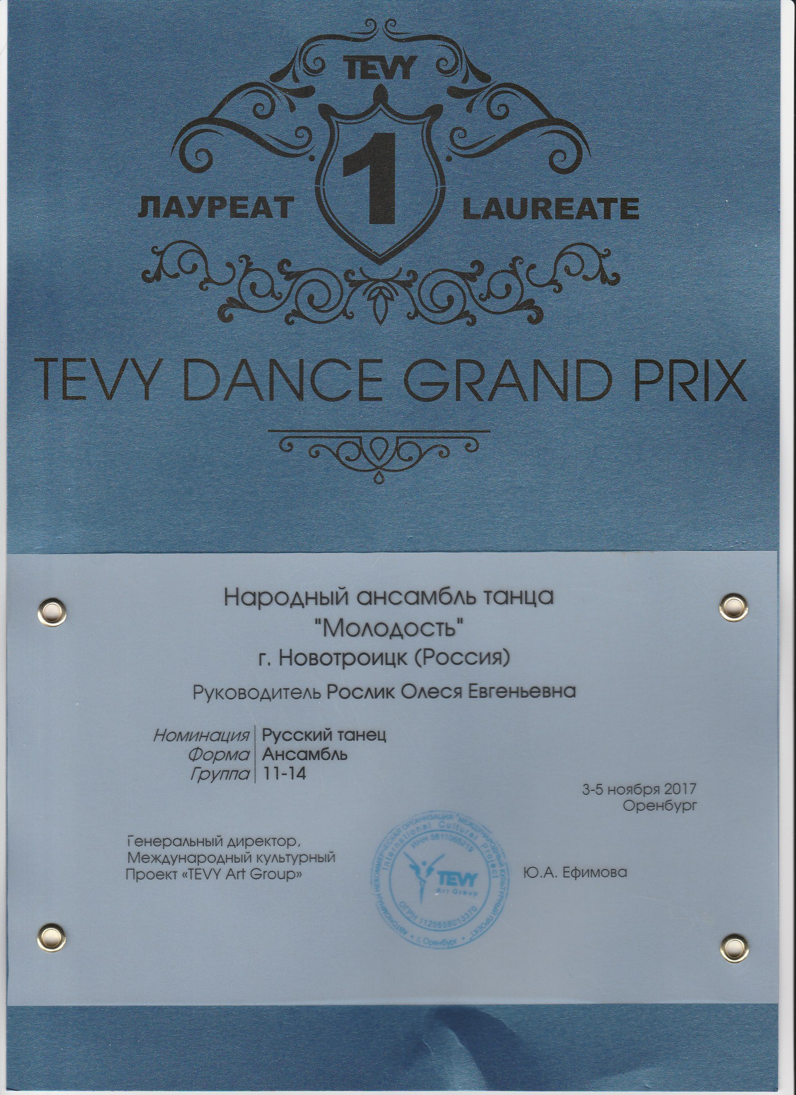 Народный ансамбль танца «Молодость», под руководством Олеси Рослик, во второй раз принял участие в Международной хореографической ассамблее "TEVY Dance Grand Prix " в Оренбурге, который проходил с 3 по 5 ноября в ДК «Россия».